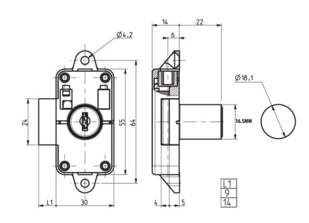 15mm Backset. 14mm Bolt Length. Nozzle Length 19mm.
