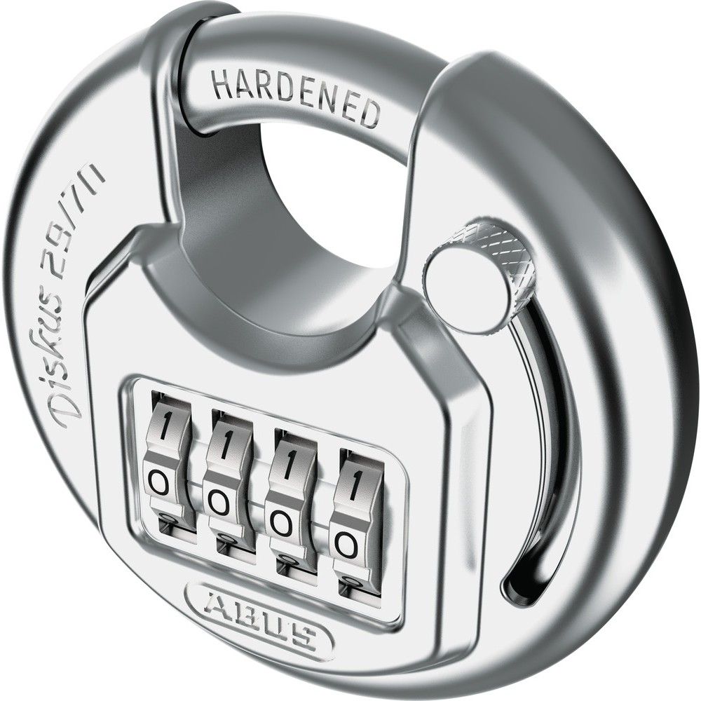 Weather-resistant Diskus® padlock with a resettable 4-digit code. The round body shields the shackle,