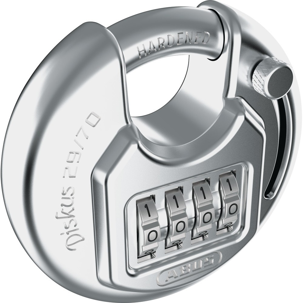 Model Diskus® Combo 29/70 Body width 70 mm Lock type Resettable 4-wheel combination (no key) Housing Stainless steel Shackle Hardened steel Typical uses Garden gates, sheds, cellar doors, storage units, tool lockers Dimensions & weight